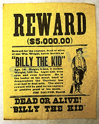 ![]() | Wanted Poster for Billy the Kid A wanted poster for Billy the Kid featuring a picture of a rebellious looking Kid. |